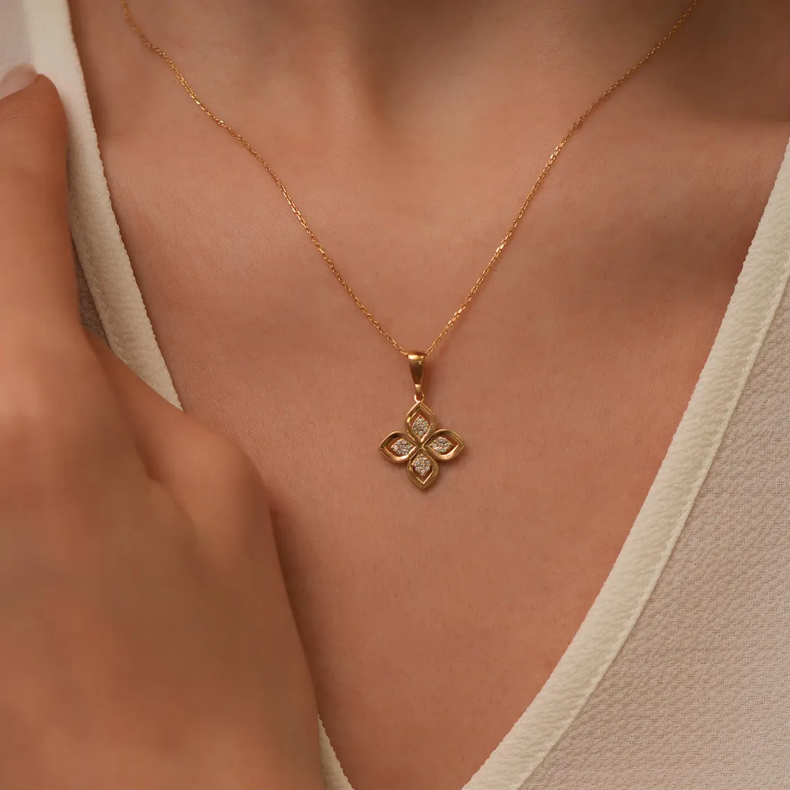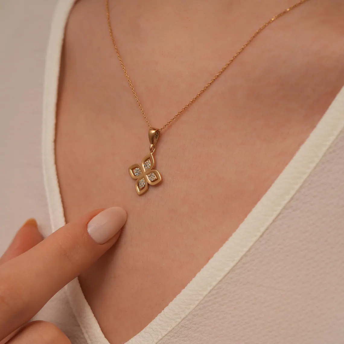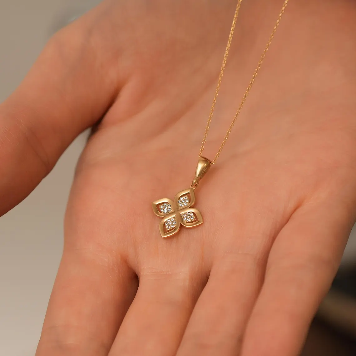 Add timeless elegance with this Gold Flower Necklace 🌸. Featuring a four-petal floral pendant with diamond accents, this piece symbolizes beauty, harmony, and new beginnings.