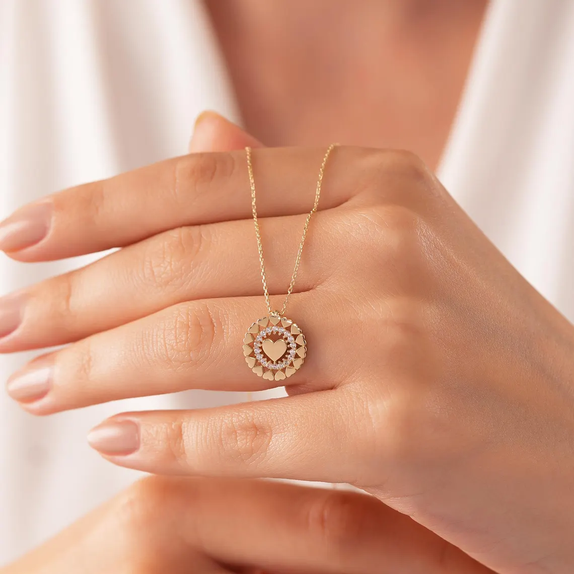 Celebrate love in its most radiant form with this solid 14K gold heart medallion necklace, elegantly encircled by delicate mini hearts and shimmering CZ stones. This thoughtfully designed piece captures the feeling of closeness, affection, and timeless devotion — perfect for life’s most meaningful moments.