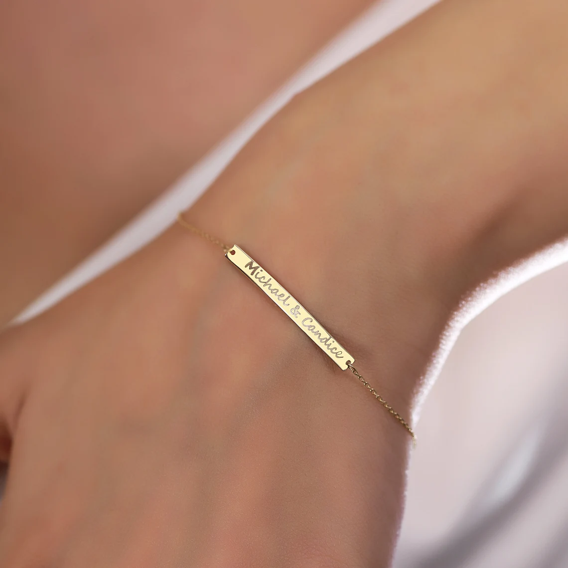 Make every moment memorable with our 14K Solid Gold Engraved Bar Personalized Bracelet, a heartfelt expression of love and style. This exquisite bracelet is the perfect canvas for personalization, allowing you to inscribe a name, date, or special message, creating a unique and sentimental piece. Crafted with meticulous attention to detail and using 14k real gold, this dainty bracelet effortlessly blends elegance with personal meaning, making it a cherished keepsake that complements any ensemble.