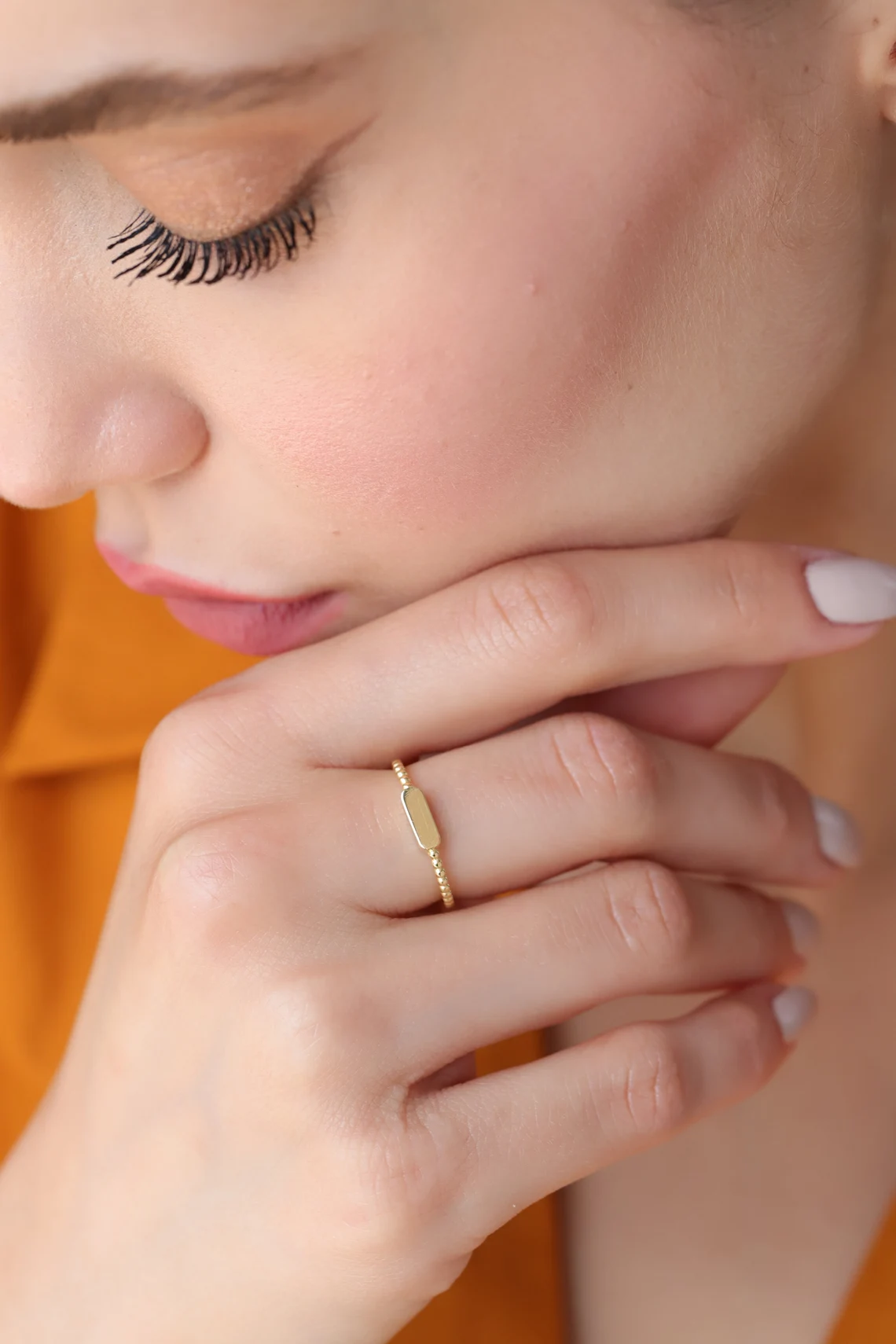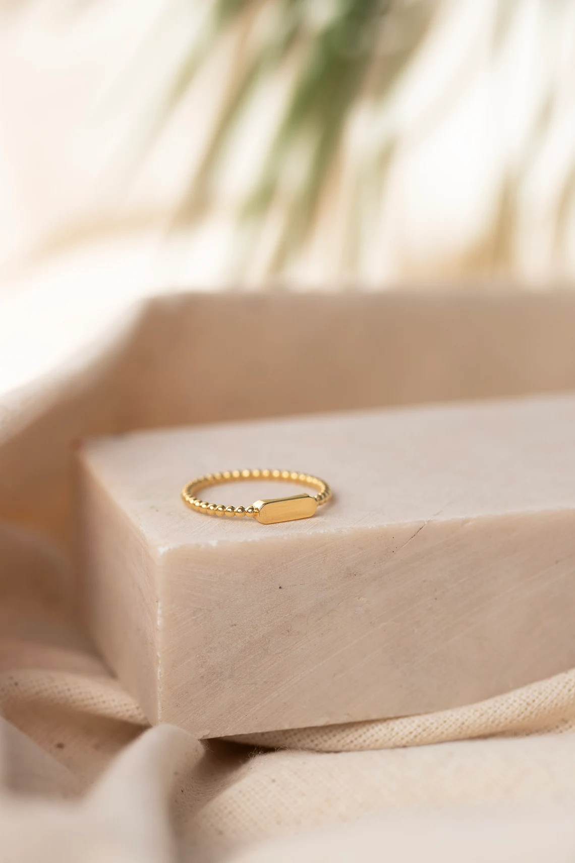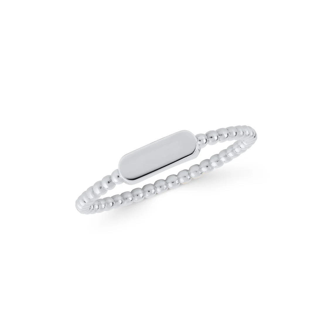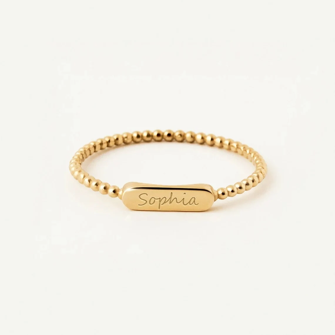Gold Beaded Band Ring with Engravable Oval Bar – Minimalist Stackable Jewelry