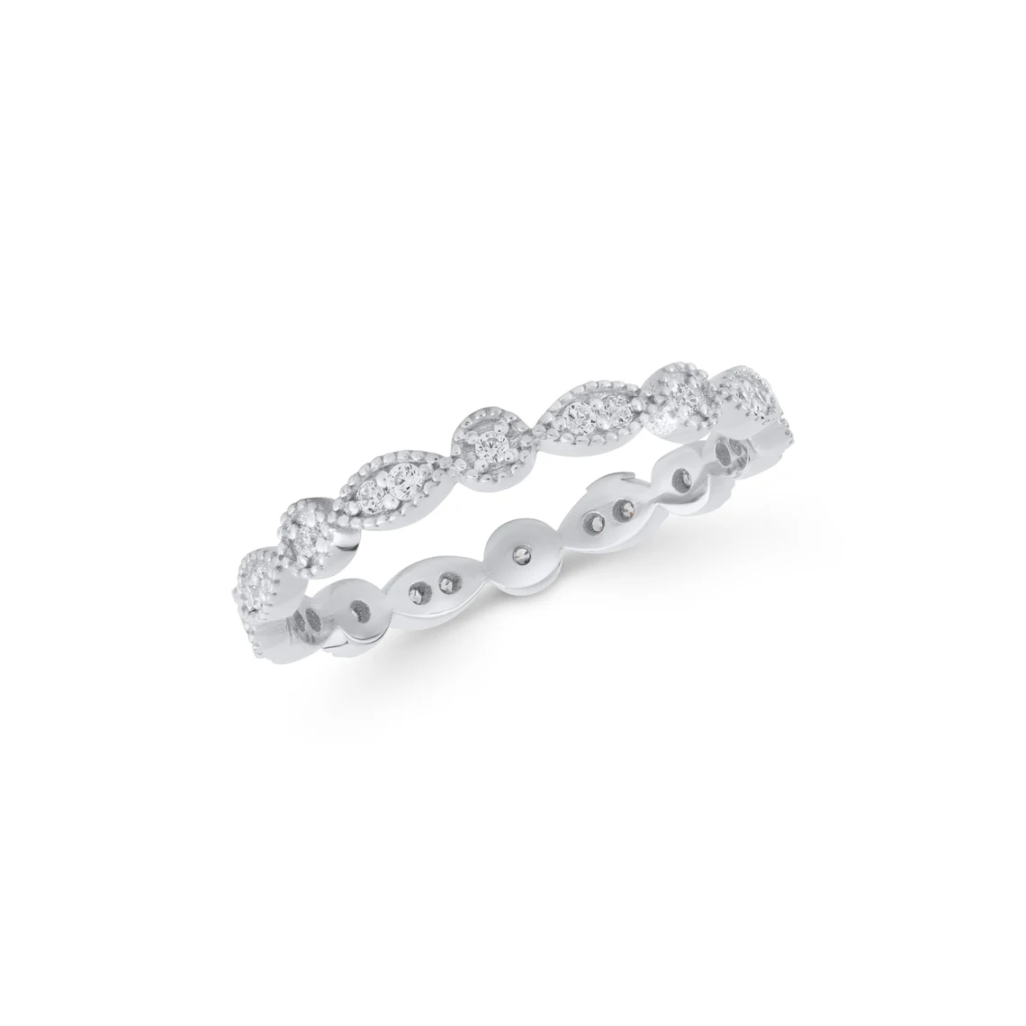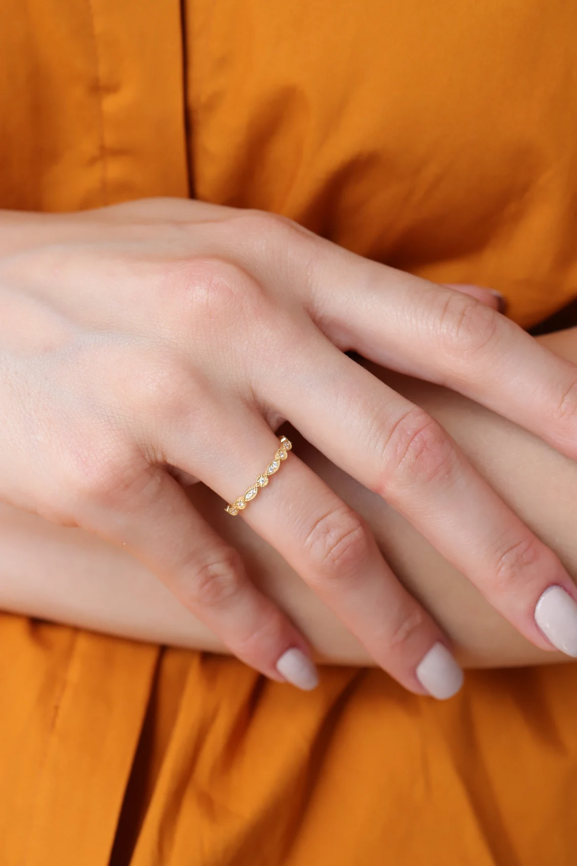 Celebrate lasting love with this 10k or 14k solid gold zircon diamond eternity band ring, featuring alternating marquise and round designs accented with shimmering cubic zircon diamonds. The delicate milgrain detailing adds vintage-inspired elegance while maintaining a modern stacking style.