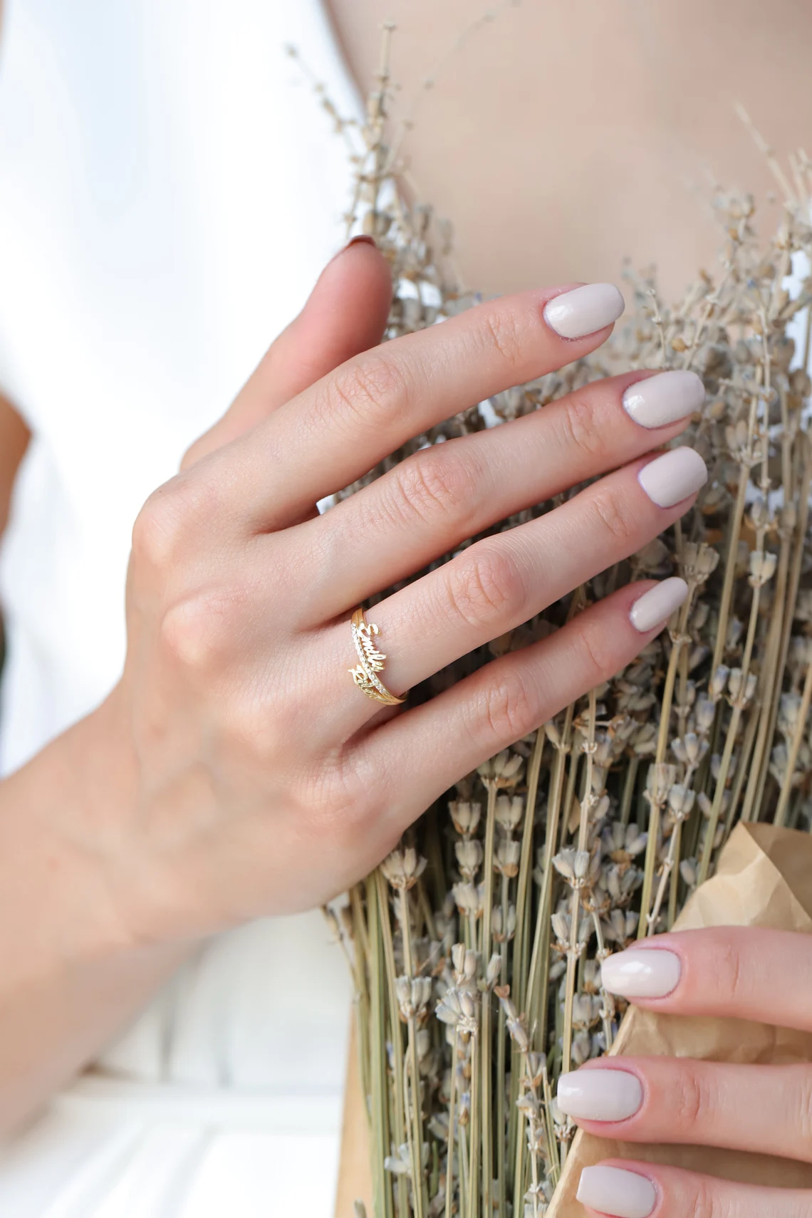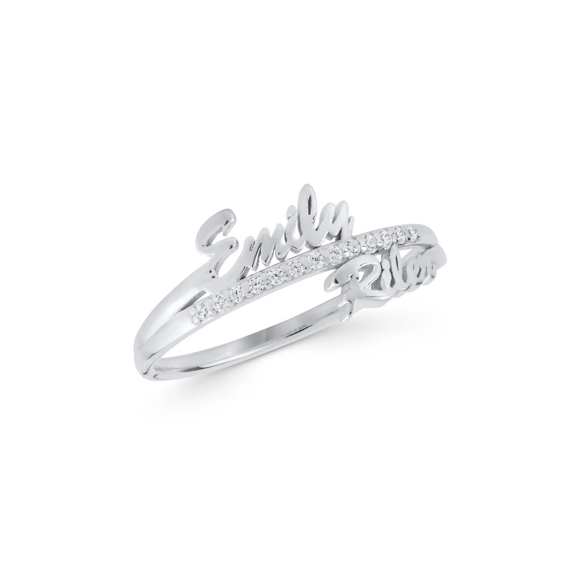 The dual-name design sits gracefully across the band, complemented by pavé diamonds that add brilliance and sophistication. Each ring is artisan-crafted to order, ensuring a one-of-a-kind piece that reflects your story.