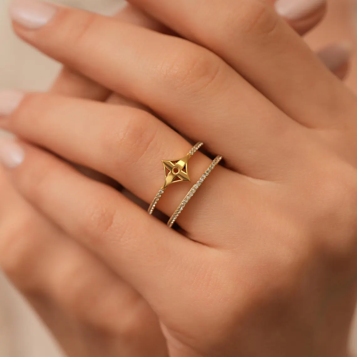 Gold Double Band Diamond Ring: Geometric Star Pavé, Minimalist Jewelry