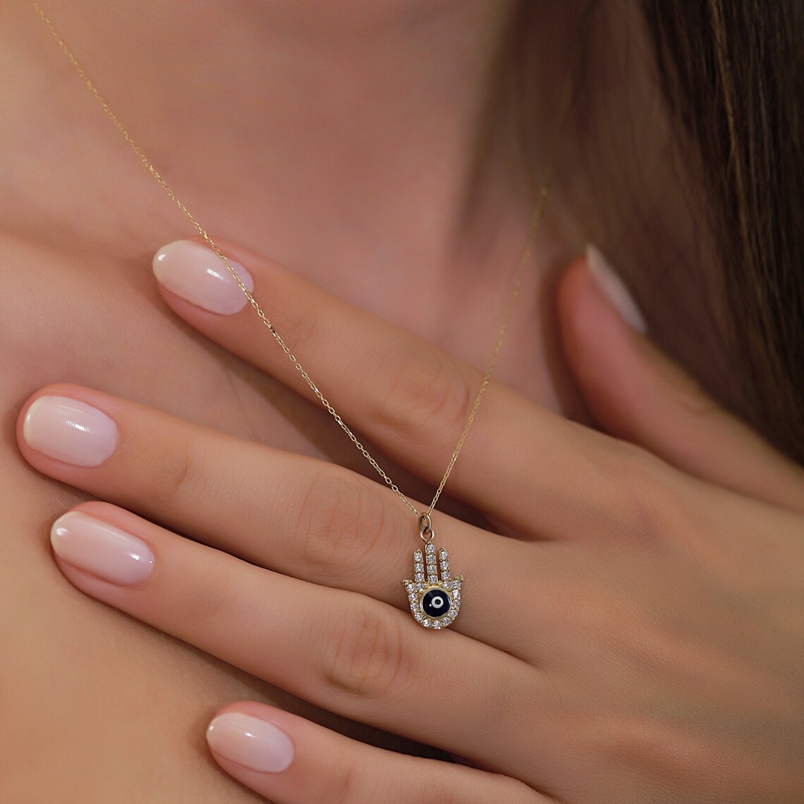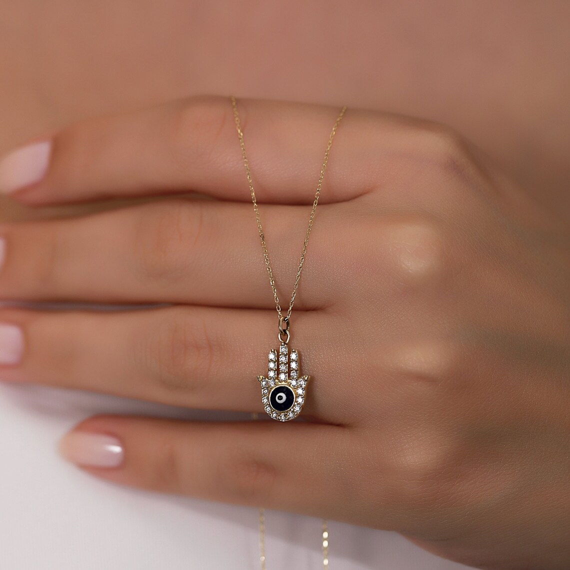 Solid Gold Diamond Hamsa Necklace – 10K 14K Evil Eye Pendant